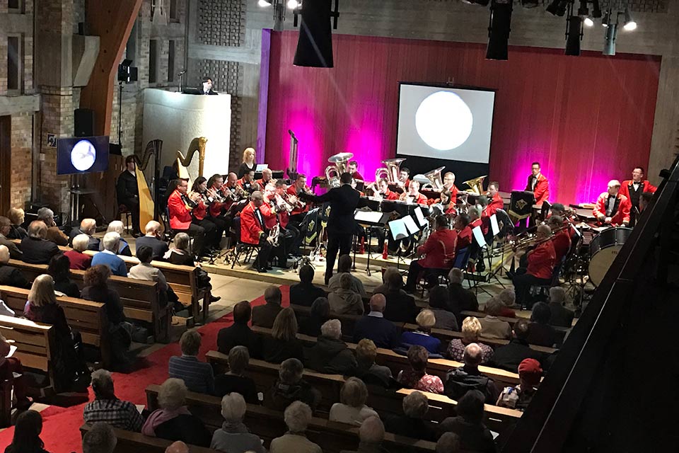 On Wednesday 1 November ArtsKeele and Keele University Astrophysics teamed up with Foden's Band to present an out of this world concert. All seven movements of of Holst's The Planets Suite were performed to an audience of over 250 inside Keele University Chapel, accompanied by a short talk by Dr John Taylor (Keele Astrophysics) and the most breathtaking Hubble Space Telescope images for each of the planets. Following the concert guests were invited to visit Keele Observatory to view planets and other spectacular night-sky objects using the Observatory's historic Grubb refractor. Over 80 members of the audience visited the Observatory and had the chance to see the moon at it's most full and spectacular!
