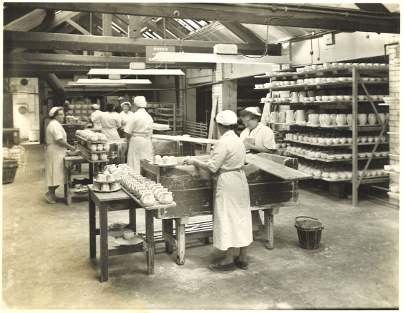 Women workers have always been important to the pottery industry. Many roles in making, finishing and decorating require skill and dexterity that women were thought more suited to than ‘clay end’ heavy work. Among the decorating tasks that women often carried out were cutting out and transferring paper prints, applying litho prints, painting enamel colours and ‘banding’ in enamels or gold. In the past, prestige painting work was more often carried out by men. Women workers also checked finished wares, selected and packed items for packing and transport- tasks that required more skill than you can imagine!