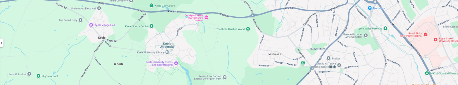 This map shows the location of the Keele University Medical School (Clinical Education Centre and Hartshill campus)