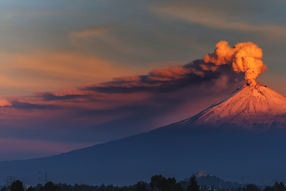 Mexico’s “smoking mountain”, pictured at the top of this article, lies 70km south-east of Mexico City and is the country’s most active volcano. The volcano is currently erupting – as it has done so intermittently since 2005 – with lava dome growth, explosions, ash plumes up to a few kilometres high and minor ash fall in surrounding areas.