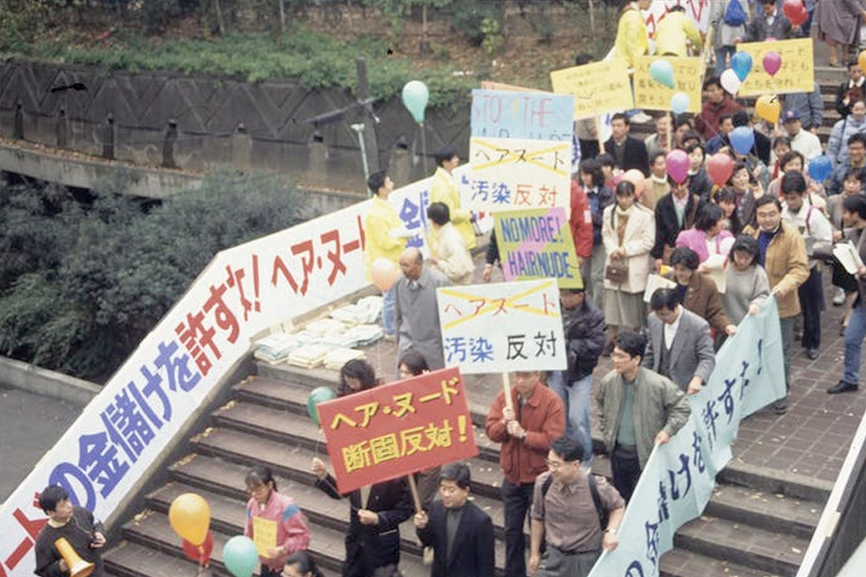 The group’s most eye-catching demonstration at home came in 1994, when a horde of protesters walked from Shibuya to Yoyogi Park in central Tokyo on a November day displaying placards and shouting “stop the hair nudes!”