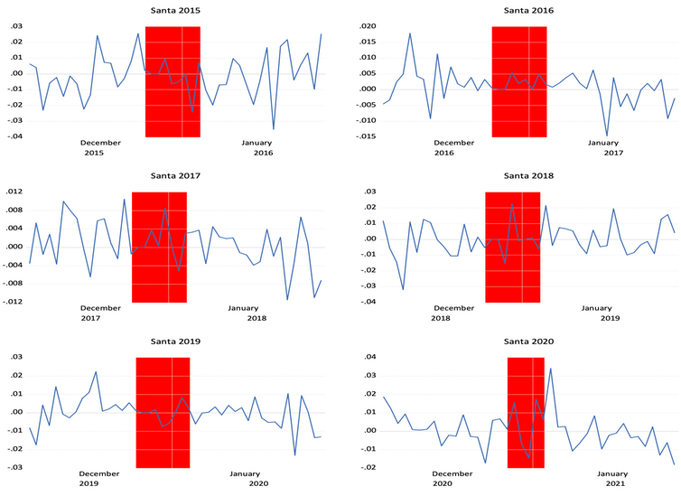 In the financial press jargon, the Santa Claus rally refers to an expected increase in stock market returns at the end of the year. The reference to Christmas is actually a little misleading, because the rally typically refers to the last five trading days of the old year and the first two trading days of January.