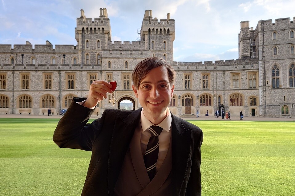 A Keele PhD student has been honoured in a ceremony at Windsor Castle to celebrate his work in campaigning for environmental and social causes, and his extensive volunteering efforts.