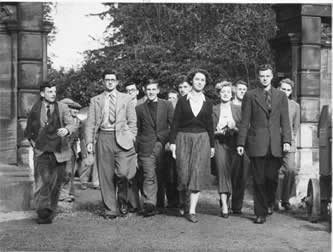 Photo right: Taken on the very first day of UCNS at Keele in 1950, these students and friends stride boldly through Keele Hall Gate, watched by builders and estate workers.