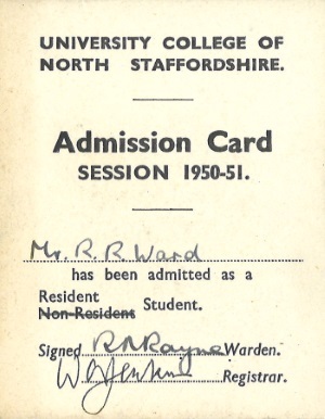 The first ever recipient of a degree was George Eason, who had studied Mathematics at Birmingham University gaining a BSc in 1951. He received his MSc in 1952 from Keele. In 1954, the first graduate to process to receive a degree Keele studied entirely at was Margaret Boulds. She received a First Class dual honours degree in Philosophy and English. She was one of three students to receive First Class Honours in the founding class of 150, the others being Stan Beckensall from Northumberland and Anna Swiatecka (Sir Jadwiga OP), who had come to Britain from Poland as a consequence of the war. The Admission Card on the right belonged to Reginald R Ward, a founding graduate of 1950.