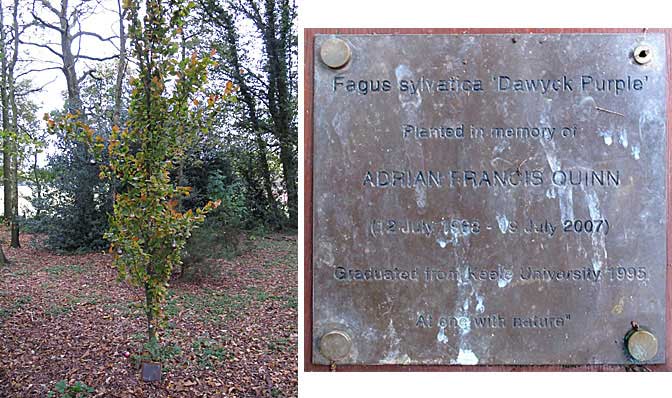A brass plaque reads "Fagus sylvatica Dawyk Purple planted in memory of Adrian Francis Quinn (12 July 1968 - 19 July 2007) graduated from Keele University 1995 'at one with nature'".