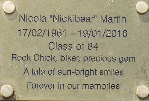 A Flowering Cherry Prunus x subhirtella 'Fukubanana' was dedicated to her memory. Square K11, compartment 24b; tag 4250. Steve Mitchell (1987 Music and Mathematics) coordinated the planting and a ceremony on 27 February 2016 was attended by over sixty people, many of them Keele alumni including James Berriman (1984 Chemistry). A plaque reads "Nicola 'Nickibear' Martin; 17/02/1961 - 19/01/2016; Class of '84; Rock chick, biker, precious gem. A tale of sun-bright smiles forever in our memories".