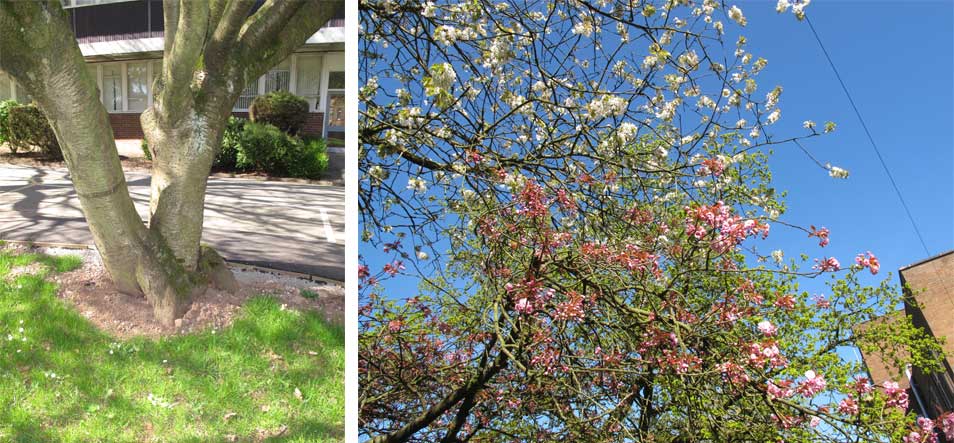 On some of the mature flowering cherries on the campus, planted in the 1950s and 60s long before the National Collection came into being, you may occasionally find pink and white flowers on the same tree! There was an excellent example situated just above the Huxley Building (Life Sciences) which was used as a teaching aid. Unfortunately, in recent years this has been removed to make way for a building extension. Cases like this often this occur when a branch starts to grow from the original Prunus avium rootstock when it was used. As the rootstock is stronger and more vigorous than the cultivar that is grafted on to it (in this case it was P. ‘Kanzan’), this branch may outgrow and even cause the death, of the grafted cultivar.