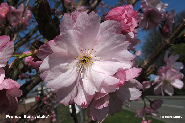 Medium-size, vase-shaped tree to 5m bearing huge clusters of highly fragrant, large, white semi-double pink flowers with a darker centre; late spring - early summer. Foliage turns orange and crimson in the autumn.