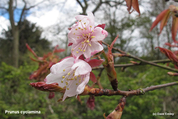 A native to China, preferring to grow at 1000–1300 m above sea level. It has prolific, attractive pale pink flowers that bloom early and outlast many later-blooming cherries. It is a sturdy tree, usually 5 to 10 m tall. Its bark is a dark purplish‑brown with prominent lenticles. Young spring leaves are an attractive bronze color.