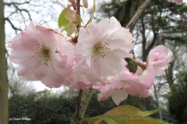 A hybrid of ‘Kanzan’ x ‘Amanagowa’. It has vigorous, broadly fastigiate growth, semi-double large flowers in long-stemmed clusters of three, mid-pink becoming darkened at the edges. Flowers end of April to beginning of May.