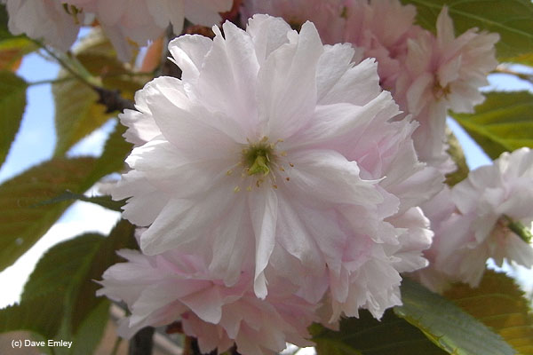 Double flowers to 5 cm dia., dark pink in bud, pink-hued white (RHS 65-C, 73-C) when open. Distinctive large purplish sepals. Pendant clusters of long-stalked 3 - 5 flowers, 4 - 5 cm dia. Opening to a flat plane with 25 to 30 or more petals pressed close to one another. It doesn’t shed its petals, rather the whole flowers drop.