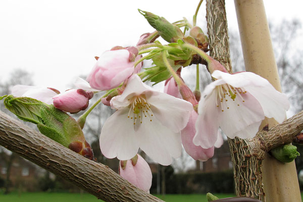 Prunus 'Martine' was selected and grown by M. André Charlier at the Arboretum Rond Chêne in E. Belgium. This cherry is named after M. Charlier’s ‘Belle Fille’. Serrulata type. Single, white, pendant flowers from pale pink buds.