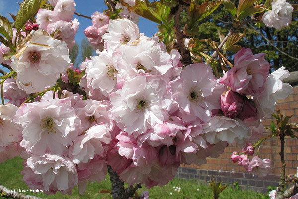 Pale-pink double flowers opening white and flat from purplish pink buds.