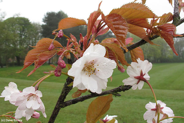 Young leaves are bronzy. Flowers are medium white semi-double, opening flat, from deep pink buds. Calyces are bronzy-green.