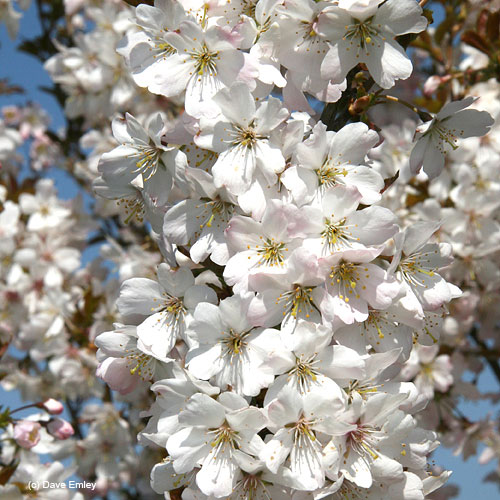 The deep pink buds open from late March through to April to produce profuse white flowers 30-50mm across with a pink flush to the edges of the petals. The leaves are bright green with a reddish yellow autumnal colour while the bark is dark shiny brown. It has an upright habit making it suitable for small gardens. It can grow to 7m with a spread of 4m.