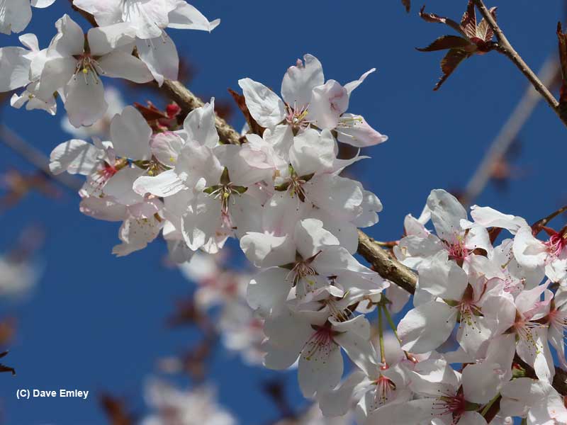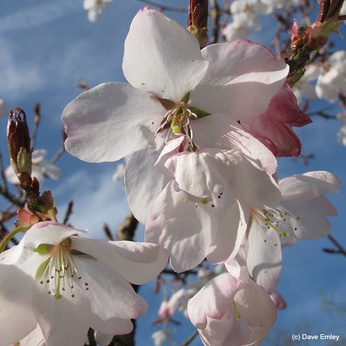 Growth looks upright vase shape. In late March, pinkish buds open to medium-sized white, single flowers with a pale-pink flush backed by dark, crimson sepals. Young foliage is bronzy coloured. The autumn foliage colour is good.