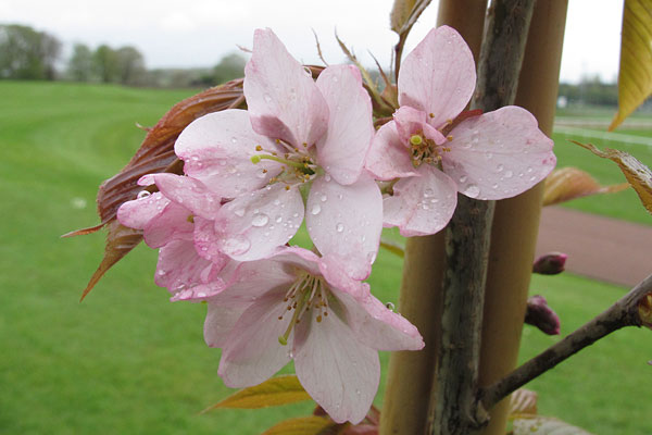 Prunus 'Saladin' - selected and grown by M. André Charlier at the Arboretum Rond Chêne in E. Belgium. This cherry is named after the great c.12 Saracen leader Saladin - first sultan of Egypt and Syria. Serrulata type. Small, pale pink single flowers. Emergent leaves are bronze-coloured.
