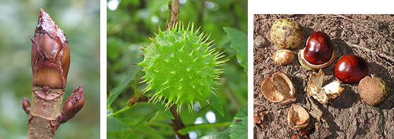 Fruit: the glossy fruits, well known to children as the "conker", give rise to the tree's American name of 'buckeye' on account of their resemblance to the eyes of a deer. They are formed inside a spiky, green outer shell and are eaten by deer and cattle. Legend has it that they were ground up and fed to horses by Turks as a cure for broken wind.