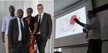 Left: Prof Horrocks (far right) with staff and head of the Centre for Biotechnology and Bioinformatics, University of Nairobi (Front: Dr Obiero). Right: Paul Horrocks giving his seminar.