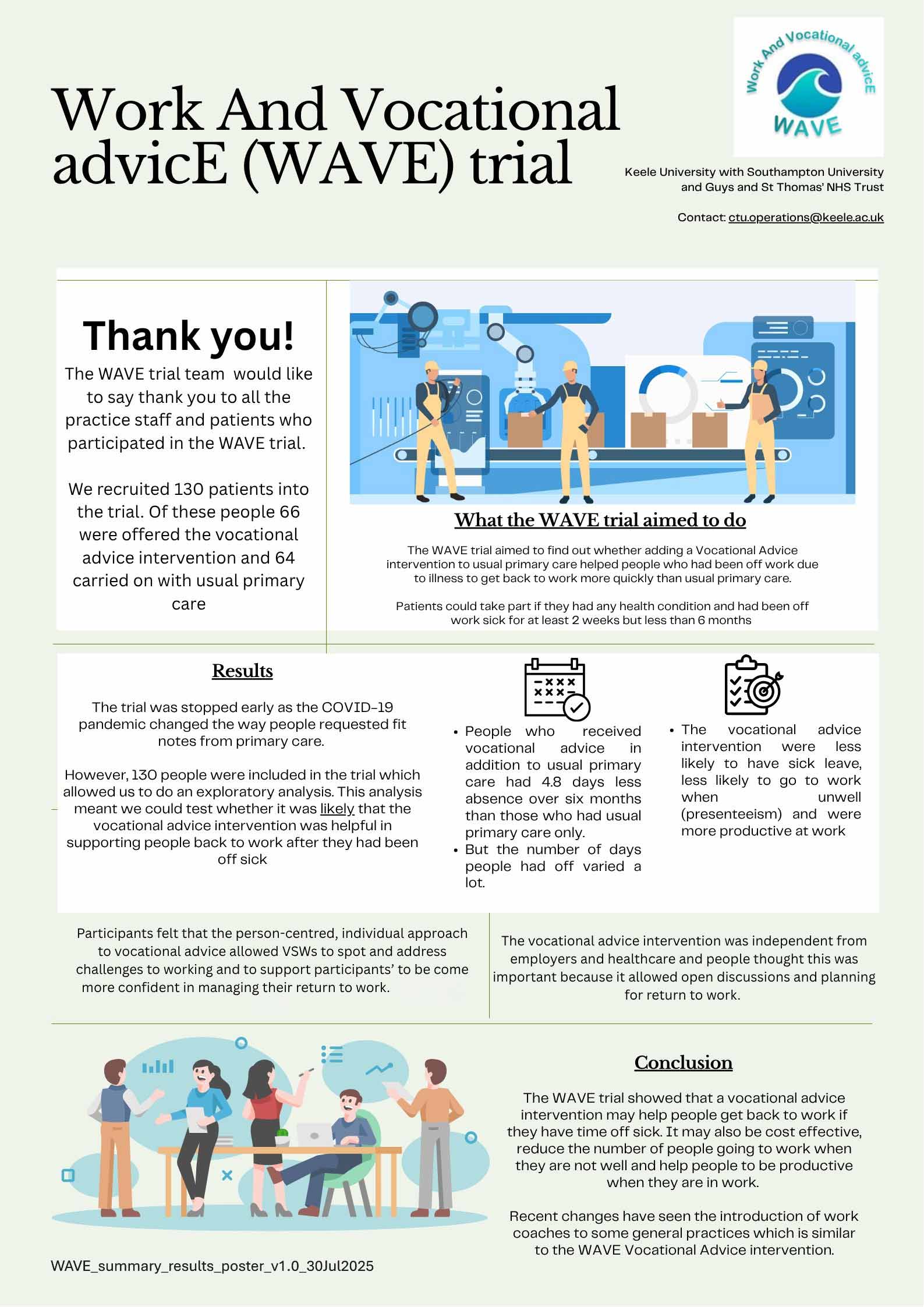 The WAVE trial team would like to say thank you to all the practice staff and patients who participated in the WAVE trial. We recruited 130 patients into the trial. Of these people 66 were offered the vocational advice intervention and 64 carried on with usual primary care.