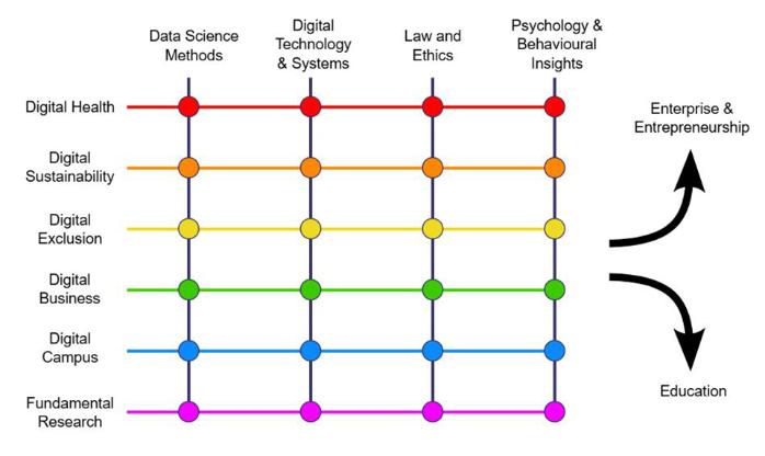 We currently focus our efforts on (but are not limited by) the themes depicted below. Building upon a wide range of expertise at Keele, DSI leads the development of cross-cutting themes (vertical in the diagram below) and applies them to several themes linked to the applications of global challenges (horizontal in the diagram below).