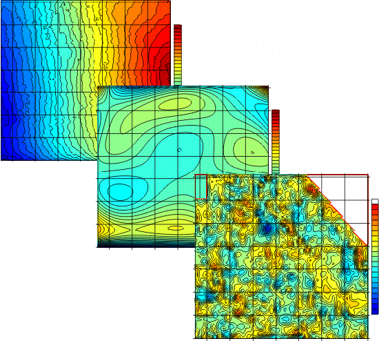 This series of plans shows how gravity data is reduced. The Raw Bouguer plan (top) has regional geological and terrain effects (central figure) removed from it resulting in the finished Residual Bouguer plan.