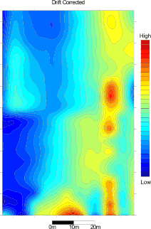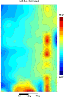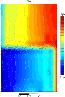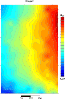 The data is now consistent across the site and a couple of interesting features are evident on the map. There is a significant N-S trend of higher gravity and a region of higher gravity along the southern edge of the map. Gravity increases the nearer to the centre of the earth it is observed i.e. with decreasing elevation. On-site, you recall the difficulties of observing one line of stations that fell in the bottom of a 1.5m deep drainage ditch, and the nearby launching slipway to the harbour. These areas were lower than the surrounding topography and therefore without the application of an elevation correction are clearly seen in the data set.
