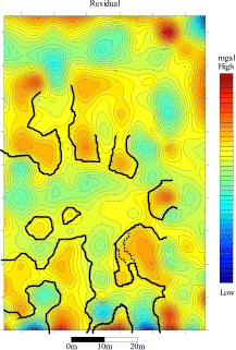 In order to examine the small scale features within the entire gravity data set, a three-dimensional polynomial surface must be mathematically subtracted from the data. The skilled removal of this surface is termed residualising.