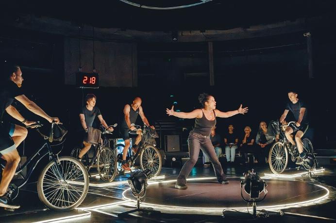 “A Play for the Living in a Time of Extinction”, a dark comedy with a serious message about climate change and the environment, was staged at the New Vic as part of its tour of the UK, with all of the power for stage lighting and audio provided by four members of the Newcastle Triathlon club using l bikes mounted on turbo trainers to generate the electricity during the performance.