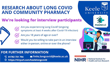 If you are interested in participating and would like more information, please contact Tamsin Fisher on fmhs.longcovid@keele.ac.uk.