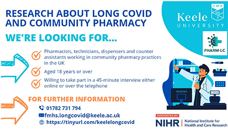 Primary care can play a key role in supporting people with long COVID, however, not all patients will seek help from their GP for their symptoms. This may be due to difficulty booking a face-to-face appointment or long waiting times. Identifying alternative opportunities to support people to manage long COVID is important. There are over 11,700 community pharmacies in the UK. These are conveniently located (e.g. in supermarket stores) and can be accessed without an appointment. Community pharmacies are well-placed to provide advice and support on long COVID, particularly when people are picking up prescriptions, COVID-19 testing kits, or seeking general health advice.