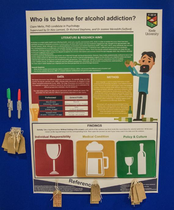 Pictured below 'Who is to blame for alcohol addiction?', a poster presented by Claire Melia, School of Psychology. This work was awarded first prize in the poster competition at the ILAS 2018 conference.