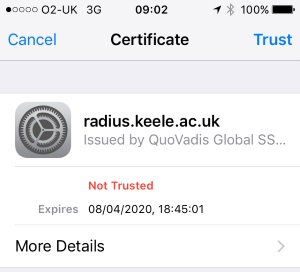 7. You may be asked to accept the Radius Server Certificate. If so, click Trust. You should now be connected and a "tick" symbol should appear next to "eduroam".
