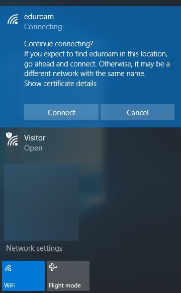 If your computer does not connect straight away, check your email address and password are correct. If you need to change your saved user details, follow the instructions on how to delete your eduroam profile (in the third accordion section below). If you still cannot connect, contact IT Service Desk.