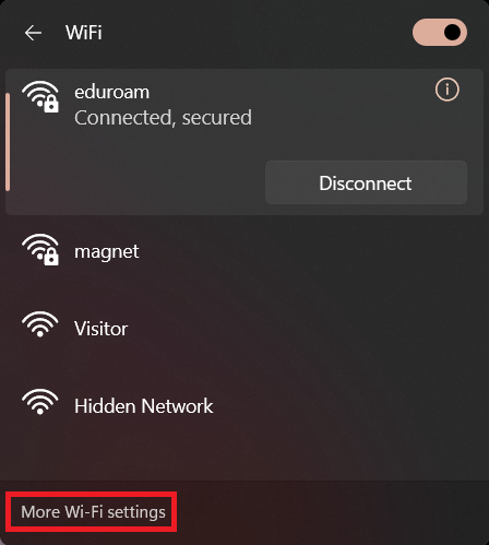- In the Wi-Fi menu, select More Wi-Fi settings at the bottom of the list. This will open the full Wi-Fi settings page.