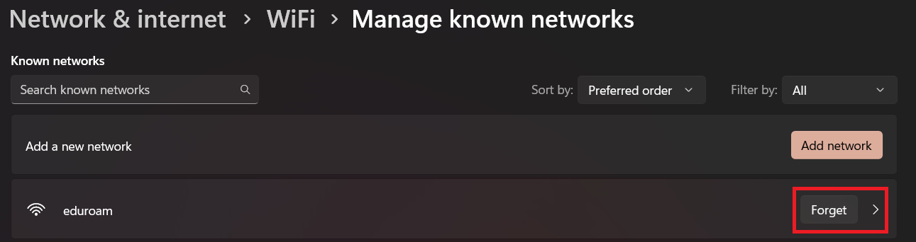 - Click the Forget button next to the eduroam network.