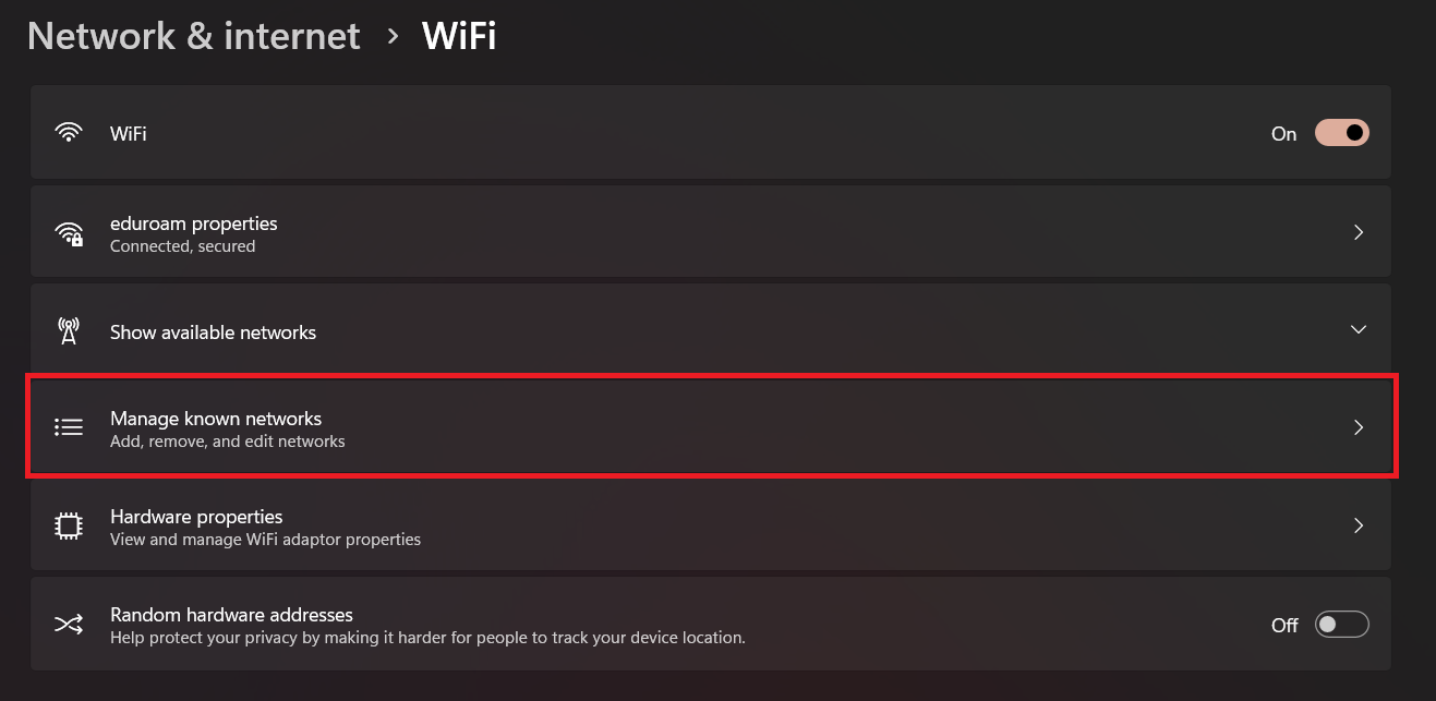 - In the Manage known networks section, you will see a list of saved Wi-Fi networks. Scroll down to locate eduroam.