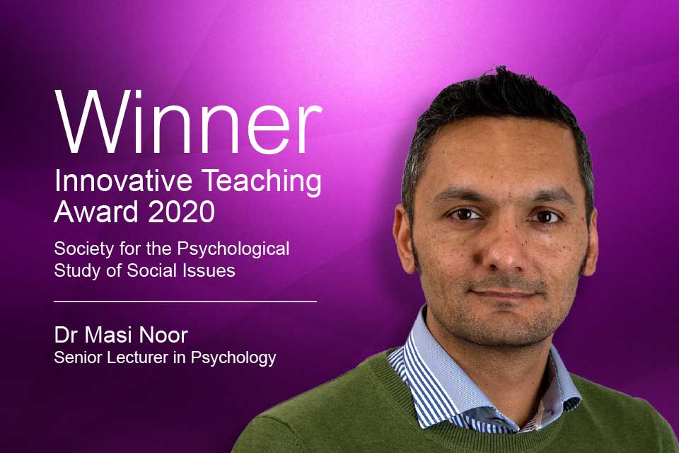 Senior Lecturer Dr Masi Noor, a specialist in social and political psychology, has been awarded the 2020 Innovative Teaching Award from the Washington-based Society for the Psychological Study of Social Issues (SPPSI).