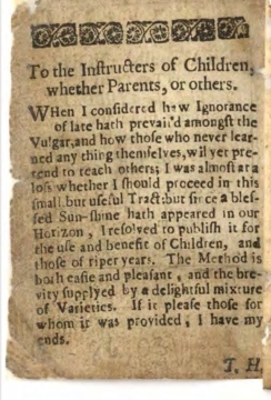 “To the Instructors of Children, whether Parents, or others. When I considered how Ignorance of late hath prevail’d amongst the Vulgar, and how those who never learned any thing themselves, wil [sic] yet pretend to teach others; I was almost at a loss whether I should proceed in this small but useful Tract: but since a blessed Sunshine hath appeared in our Horizon, I resolved to publish it for the use and benefit of Children, and those of riper years. The method is both easie and pleasant, and the brevity supplyed by a delightful mixture of Varieties. If it please those for whom it was provided, I have my ends.”