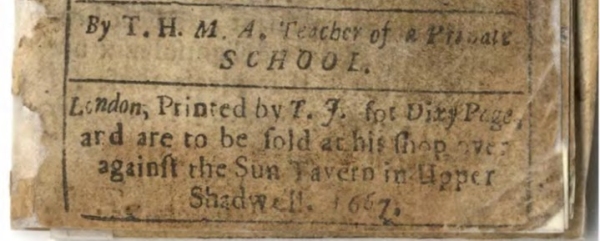 Further investigation of printers and booksellers working in England led me to information on the London seller of our book, Dixy Page. I discovered that in April 1666, a year prior to the publication of the Guide, Dixy Page and the printer Thomas Johnson were imprisoned for dispersing seditious books and were bound over in a sum of £500.2 As Thomas Johnson is linked to Dixy Page during this period, we can presume that Johnson is our anonymous printer T.J., solving this particular mystery.