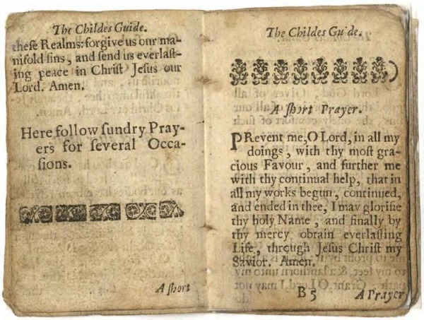 Pages inside the Guide demonstrating the use of a catchword. ‘A Short’ can be seen on the bottom of the left page, with a ‘A Short Prayer’ being the start of the next page.