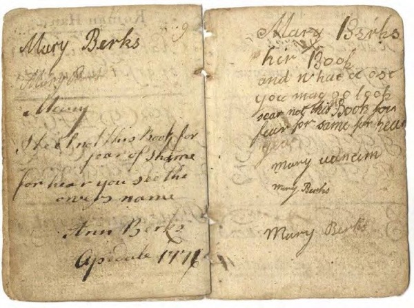 Handwriting by Mary and Ann Berks, dated 1776, found inside A Guide for the Childe and Youth