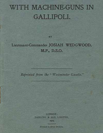 Wedgwood played a prominent part in the Gallipoli expedition. His first-hand account describes the landing on 25th April 1915 and the taking of Sedd el Bahr fort. He also details how the terrain was unsuitable for armoured cars and so the eleven machine guns were dismounted and placed on flat stands on the bow of the beached ship, SS River Clyde, on V Beach.