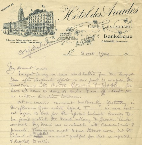 Letter from Josiah to his family, written on the headed paper of a hotel in Dunkirk, 3rd Oct. 1914 [JCW7]