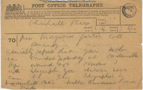 Telegram from Walter Runciman informing Wedgwood’s daughter that her father has been injured, 11th May 1915 [JCW8]