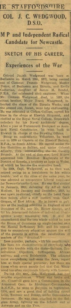 Extract from the Staffordshire Sentinel, Dec. 1918 [JCW6]