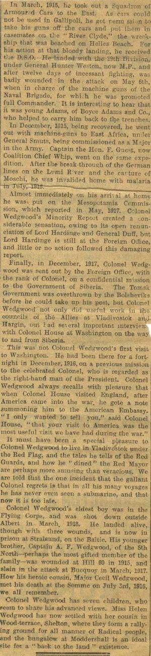 The Staffordshire Sentinel newspaper held Wedgwood in high regard and after the war was over, published a short sketch of Josiah’s life up to that time. It includes Wedgwood’s education, political career and wartime achievements, also mentioning Josiah’s children and how they fared during the war years.