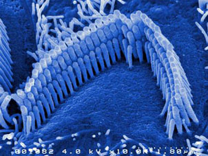 Another of my major research interests is cochlear hair cell structure, composition and function. I am focussing on the hair bundle and how the hairs (stereocilia - see picture) function to convert mechanical action from sound stimulation into electrical signals and nerve impulses in nerve fibres going to the brain.