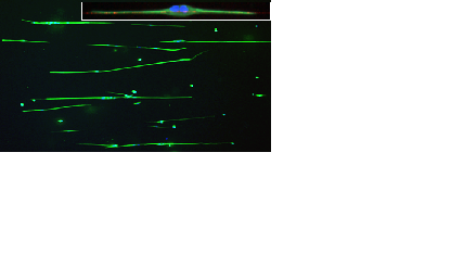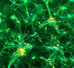 Astrocytes aligning on polymer nanofibres embedded in hydrogel, photo Divya Chari |